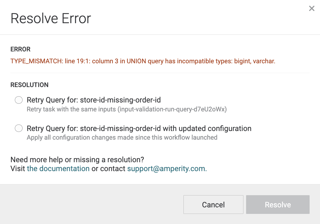 Retrying the workflow without making any changes is the option you should select if the error is transient and has been resolved outside of Amperity. For instance a destination service was down for maintenance and Amperity could not send it data. Or data was not available for Amperity to ingest from a source service.