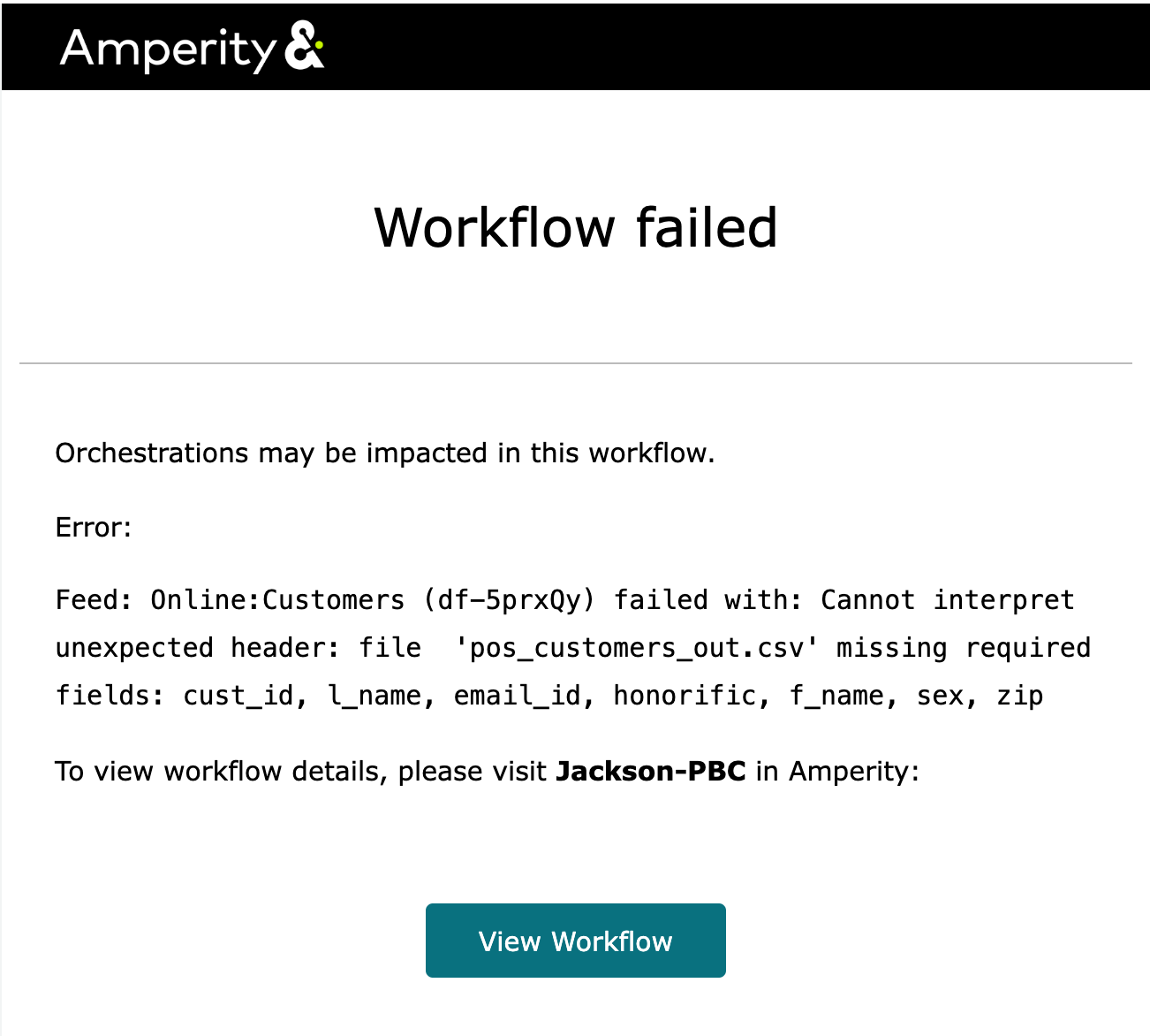 To review the error you can either click "View workflow" in the email you received about the error. Alternatively you can access all workflows via the "Workflows" page in Amperity and select the workflow you are interested in.