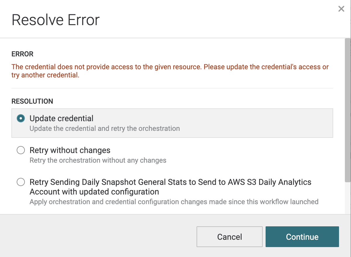 Depending on the error there may be additional resolution options that are displayed. For example the workflow error below is caused by an issue with the credential that has been provided. By selecting the option to "Update Credential" Amperity will guide you through the process of updating the credential associated with this orchestration and retrying the workflow.